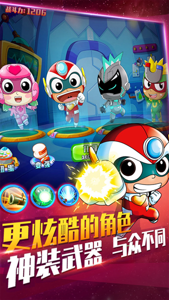 在游戏中,每一个开心宝贝都拥有着他们在动画中的特色变身,且所有的变身都有相应超人的特征,加上功能与外观各异的弹幕,给予你视觉上的炫酷无比的享受,同时,为了玩家们更加能体验到那种激血畅爽的打击快感,我们还特意强化每个超人的必杀技,让玩家high到停不下来!