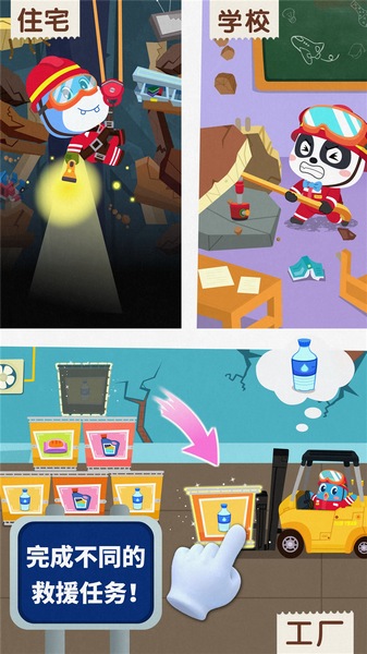 宝宝地震安全3这款游戏是由宝宝巴士和北京地震局联手打造,旨在通过游戏的形式向孩子们传授地震安全知识。在这个模拟的地震环境中,孩子们将化身为勇敢的救援者,面对一系列挑战。从遥控无人机获取灾区地图,到挑选合适的救援工具,每一步都充满了紧张刺激。隧道跑酷环节更是让小朋友们在躲避落石的同时,体验到速度与智慧的结合。