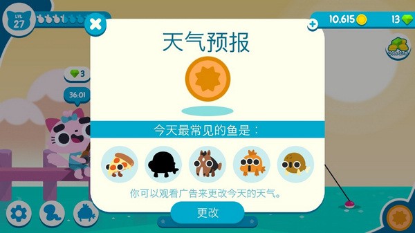 小猫钓鱼破解版是一款休闲有趣的钓鱼小游戏,玩家在游戏中扮演一只钓鱼的小猫咪,为了可以钓到更多的鱼,游戏中还为大家准备了各种各样不同的钓鱼工具,每个不同的工具都可以帮助大家钓到不同种类的鱼。而且游戏中还设置了不同的天气系统,需要注意的是一些鱼类只在某些特殊的天气出现,所以要时常关注天气预报。游戏整体玩下来非常轻松解压,游戏中还有非常多的钓鱼任务,完成任务就可以领取各种奖励,快点来抓鱼吧!此版本提供内购破解版,点击购买即可成功,快点下载体验吧。