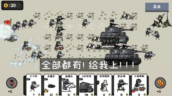 1.长期多派点冲锋兵往前冲,如果对面修起了塔,最好带些炮兵,还有如果前期金币够的话,买那个骑兵连长,血量很厚,攻击也很高,可以秒玩。