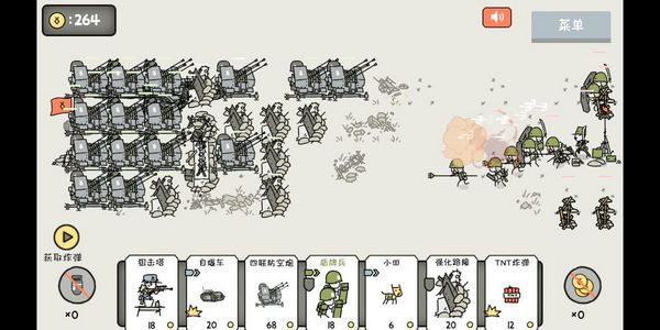 玩家防守的还有各种防御塔系列,我觉得防御塔中的堡垒把那个中间的四个格子各走一个,基本上对方就打不过来了。然后机枪阵地争对步兵来说非常的凶,一枪可以打一点二的生命值,连续四场,而步兵的生命值最高也就是15点左右。
