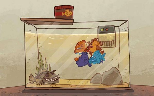 29、第二十九关:大鱼要吃小鱼,好怕怕。点击页面上的鱼食,挪到左边,可以看到后面有一瓶,能力瞬间变大的能量药,倒进水里,给小鱼吃。再点一下大鱼,大鱼顿时吓尿啦。