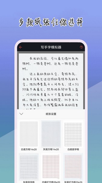 手写字模拟器免费版App是一款非常好用的写字模拟软件,在这里,不仅内置多种不同类型的字体型号,更有超多种纸张背景可任由你随意挑选进行使用,能够完美模拟真实的手写效果,而且支持自由调整字行、字间距以及字体大小波动等,充分贴合了真实的手写效果,除此之外,这款软件还支持云端预览,在你写完相关内容之后即可轻松查看相应的手写字迹效果。