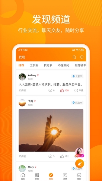 行业交流,能够与同行业或同乡的用户一起沟通;