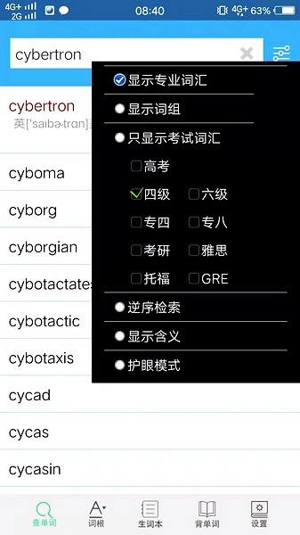 3、通过自助读你可以导入考研、托福、雅思、GRE的真题,词根词缀记忆字典帮你查单词并作出标注,不认识的词随时可以导入背单词列表。自动提取文章里的单词,记录熟悉的单词;