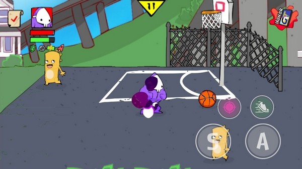 6、篮球场关卡,躲避篮球攻击,可投篮娱乐,利用篮球和足球作为移动工具。