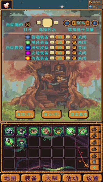 3、药水下面是自动出售,需要打开设定等级才会自动出售,设定10就是只卖10级以下的装备超出不会卖,前期捡够身上穿的就把白、绿、蓝直接拉到100级卖了,这3个装备属性没紫色好。