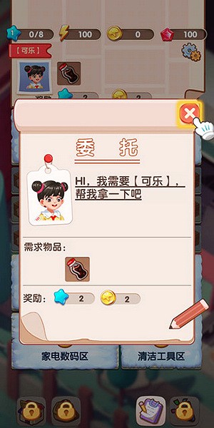 合成玩法与模拟经营结合:玩家通过合并商品解锁更高阶品类,例如将两瓶矿泉水合成为可乐,满足顾客订单需求。这种合成机制不仅增加策略性,还能逐步解锁鲜花、蔬果、家电等数百种商品品类,还原真实超市经营体验。