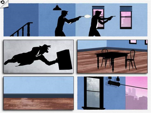 如下图所示调转图片位置,当警察开枪射击的时候,主人公飞身一跃,桌子侧翻在地挡住了子弹,主人公便可以趁此机会跳窗逃走!正字啊看小编此篇致命框架攻略的你是不是也被主人公矫健的身姿所折服!