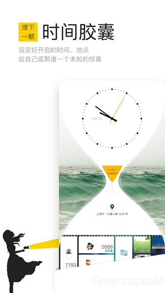 你可以埋下或送出一个时间胶囊,给你自己和关心的人一个未来的惊喜,可以指定开启时间,甚至指定开启地点;