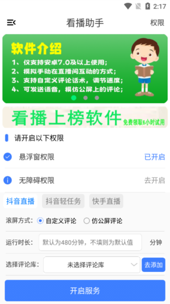 这款看播助手应用专为安卓用户设计,是个挺实用的直播辅助工具。它能帮你在直播间自定义评论内容,还能随时暖场,特别适合那些需要完成看播任务的人。作为新手或资深玩家,这个工具都能让直播变得更轻松有趣。