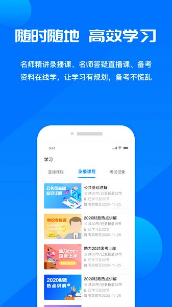 公考课堂的在线学习体验不输于传统教室:播放讲义、双向视频、举手发言、课后回放、离线缓存、倍速播放,让你真真正正把知识学完、学好、学到!