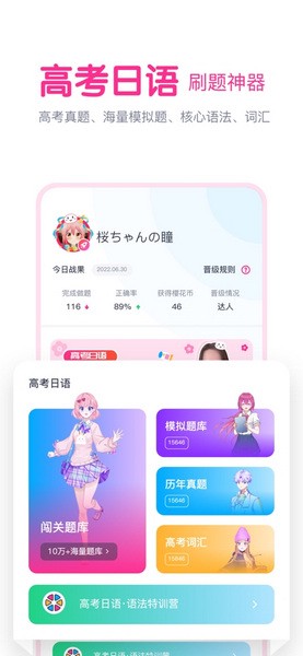 1、樱花斩为高考日语、日语能力考级(JLPT)提供海量做题练习和复习备考服务。
