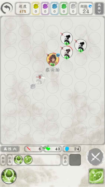 1、新手阶段。熟悉基本操作,在棋盘上点击可以移动或攻击。战术1龟角落,抢占角落可以让你只面对2个敌人。战术2 hit&run,冲上去打一下就走boss战用。(1、1、5本次更新前是会乱追击以及罚站的,本次更新后体验大幅提升,不但可以安心龟角落不乱动,而且不会丢失索敌,手动移动的时候还会顺手打人,正所谓路过的狗都会挨一巴掌,现在可以流畅使用进阶版hit&run战术游走在怪群之间只要路没堵你就是亚索)。装备等级甲乙丙丁戊,每一个等级属性碾压后一个,差不多每过一个地图解锁下一级。副本内掉落,每10层一个阶级,40层开始掉落甲级。别忘了右上角的每日任务和右下角的江湖见闻,蚊子再小也是肉。