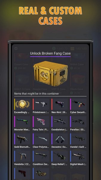 CSGO模拟器是一款可以让玩家体验到CSGO游戏中大部分游戏乐趣的模拟类手游。在这里我们可以通过模拟战斗来获取奖励,不需要玩家进行具体的操作,可以轻松地享受对战的乐趣。同时在获得奖励后,能够去开启各种箱子来收集游戏中的皮肤、饰品等道具。此外游戏中也是有很多成就可以完成的,而且还有模拟的交易市场可以体验。游戏特色