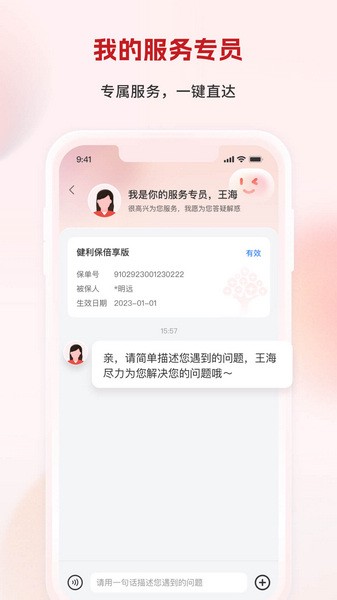 【我的服务专员】客户直接与保单服务人员在线即时通讯,支持文字、图片及音视频沟通。