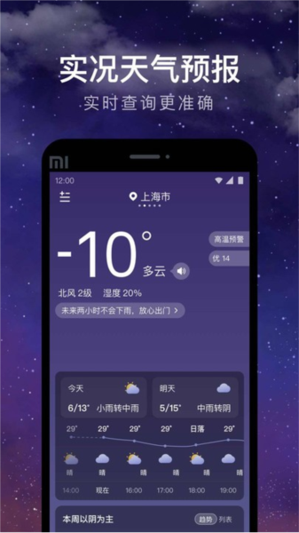 当日天气:显示当日气象、温度、风力、风速、气压、湿度、降雨概率、紫外线指数、能见度等详细信息。