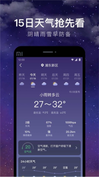 15天预报:详细预报未来15天的天气状态,包括温度、风向、空气质量等信息,助您早做出行计划。