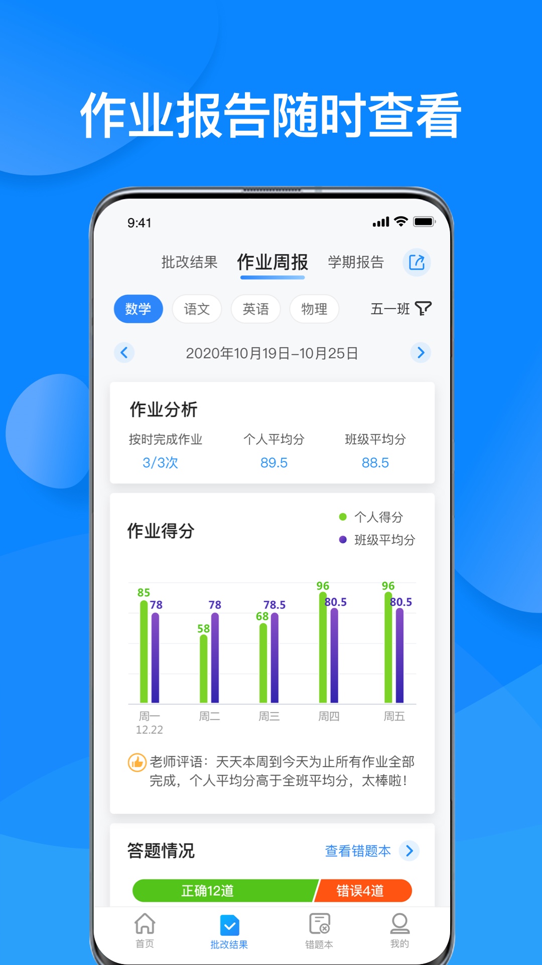 2、极速阅览到得分,实时查看各科的平均分