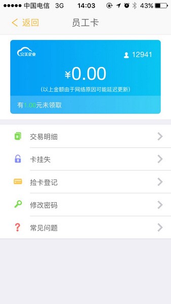 1、员工卡:手机充值方便快捷,消费明细随时掌握。