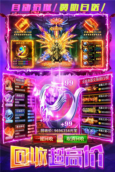 无首充送神装,自动回收轻松赚元宝 自动拾取系统,轻松赚取海量资源,助你一飞冲天!赞助白送,玩得更爽,人人都是土豪!
