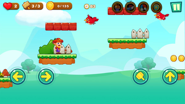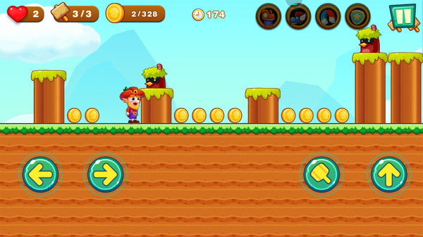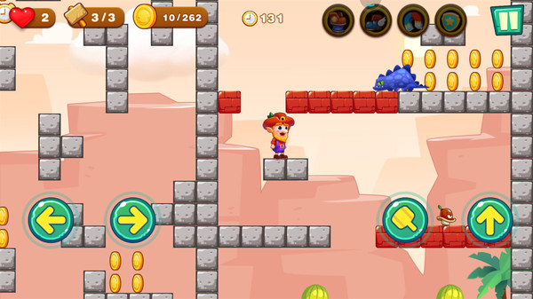 超级大冒险是一款横版闯关游戏,玩法非常经典,玩家需要控制角色在复杂的关卡地形中前进,在越过各种障碍和刁钻地形的同时还需要去尽可能多地拾取沿途的金币。每个关卡都有上百枚金币可以去获取,而且还会显示玩家当前的收集进度,让玩家知道自己还有多少没集齐。另外操作方面也是很容易上手,除去方向和跳跃之外,只有一个攻击按键,可以用来击败阻挡自己前进的小怪物。