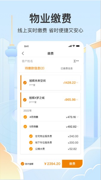 3、自动生成物业账单,在缴纳物业费用的时候可以对物业账单明细进行直接查看;