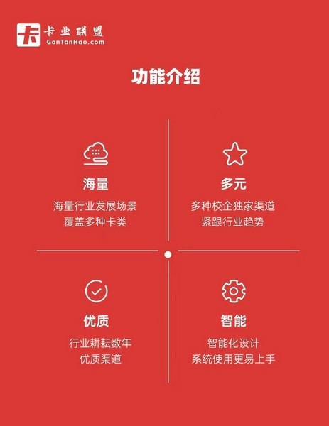 卡业联盟是一款很实用的流量卡分销管理软件,主要是帮用户快速成为号卡代理商。他们直接跟三大运营商签约了,提供各种类型的电话卡,比如流量卡、国际卡等等,而且资源随时更新,方便代理们随时扩展业务。