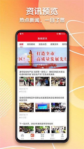 2、资讯页主要为热点新闻,分为政务要闻、民生动态、政策文件、政府会议等新闻,用户可以查看资讯详情;