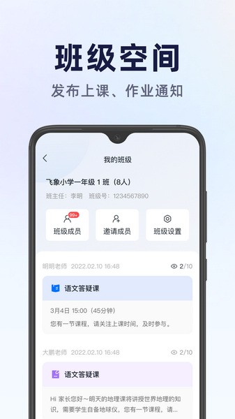 【班级空间】老师建立班级,邀请任课老师及学生加入班级,并在班级内发布各类通知、开设线上课程