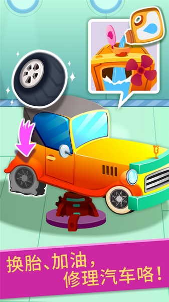 【宝宝修车店】是一款幼儿早教启蒙模拟汽车修理的APP,是喜欢汽车宝宝的福音哦!宝宝角色扮演汽车修理师傅,体验模拟经营修车店、换轮胎、加汽油、洗车、设计汽车造型等乐趣环节,让宝宝了解车辆结构和修理方法,轻松学习各种汽车知识,提高动手能力。