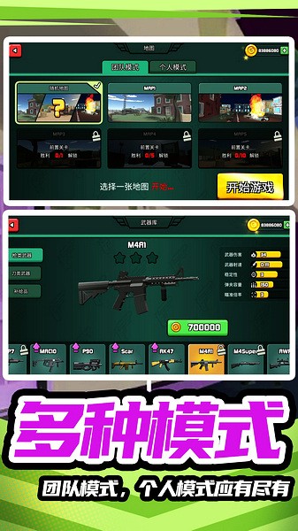 2、你可以选择团队模式或者个人模式,还能选择地图进行游戏。
