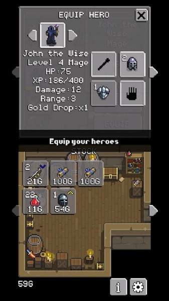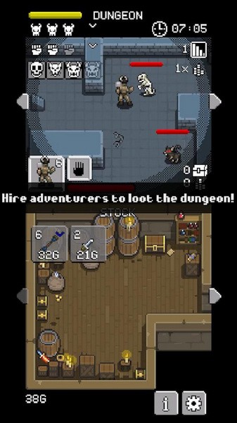 2、雇用冒险者并为他们装备物品,然后将他们送入地牢为您收集黄金和战利品。