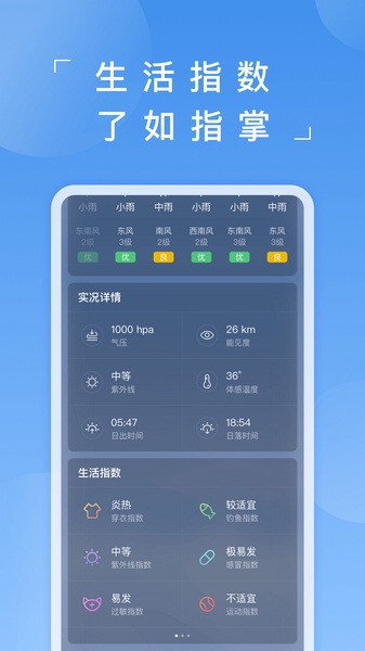 1、根据这些天气状况,准备旅行活动,制定计划,每天获取更多天气内容,并快速了解指数信息。