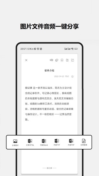 此外,酷记事APP还提供了多种便捷的编辑工具,支持应用分屏和多种字体更换,让用户感受到创新设计带来的便利。用户可以随时记录灵感和重要事项,保持高效工作和生活。无论是写日记、记账还是签到,酷记事都能满足用户的需求。