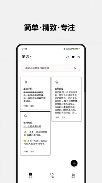 酷记事应用整体采用纯色调,线条和文字清晰对比,功能层次简洁,可侧滑删除/置顶,编辑页功能区域默认折叠。另提供极简模式,专注只为写作。