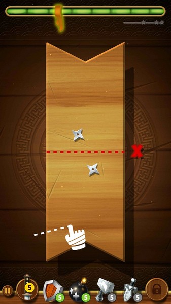 2、在一块木板上飘飞着几枚飞镖,用户要做的就是通过手指划动,切掉一块块木板,让飞镖的活动区域越来越小,当缩减到一定程度后,就能够顺利过关了;