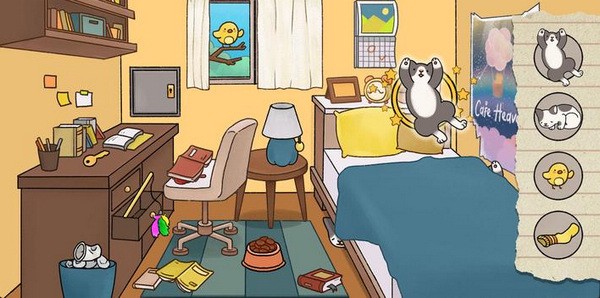 游戏里有很多隐藏的小细节,比如拉开窗帘会有小鸟出现,或者晃动手机就能让猫咪跑出来,这些设计真的挺用心的。卡通风格的画面也让整个过程看起来很轻松愉快,适合休闲娱乐。