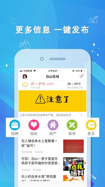 白山在线app是一款非常好用的本地生活服务软件,通过系统快速的资讯搜索功能,为用户提供最新、及时、丰富多彩的信息服务。这款软件不仅可以帮助用户轻松租房子,还能让用户了解当地热点、天气状况等实时资讯。无论是查电话、找工作、装修量房,还是活动福利等,白山在线都提供了合理且丰富多彩的服务功能,让用户能够轻松完成各种日常生活需求。