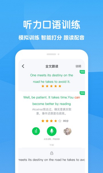 对自己的跟读训练进行评分,纠正自己读的口语发音。