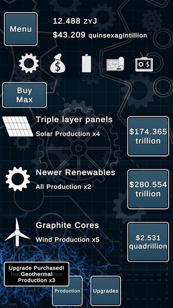 通过投资能量和金钱来合成电池来扩大您的影响力,从而提高能量的基本价值,更快地增加利润。如果这还不够,ldlePower还包含一个合并游戏,使电池能够相互合并以产生更强大的电池,从而进一步增加您的利润-从而增加您的产量。
