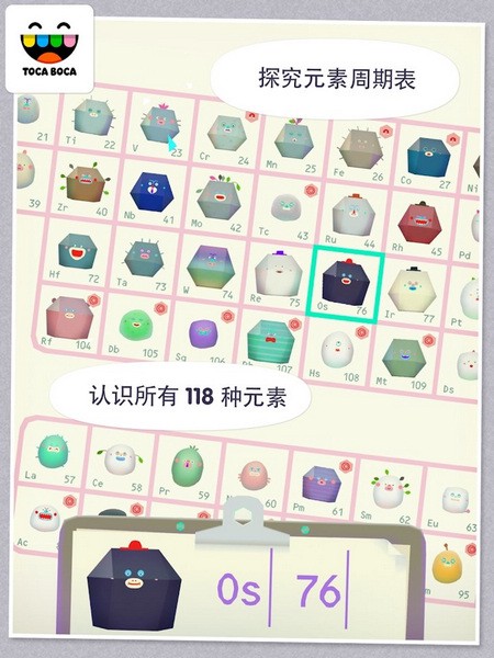 欢迎来到 Toca 实验室!齐来探索奇幻多彩的科学世界,并认识周期表中的 118 种元素吧。