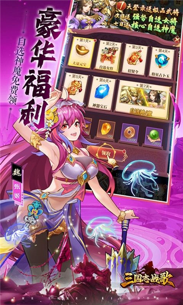 1、【豪华七日礼】海量元宝首日必得, 次日领强力神魔粉将,红装套装,七日再领强力神魔粉将