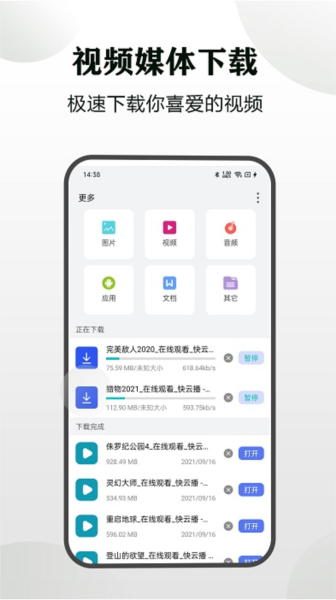 加速通道:在这个软件当中下载文件或者视频图片的时候,基本上都是在一分钟之内就能够完成相关的下载内容的;