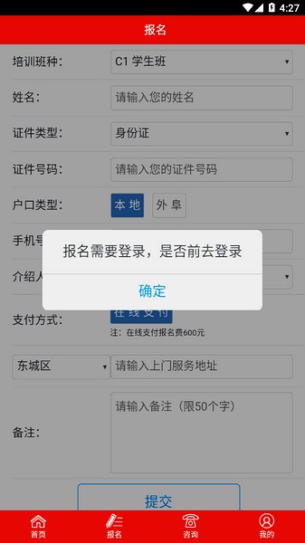5、点击底部“报名”,北京公交驾校的学员输入选择班种和个人信息,在线支付报名。