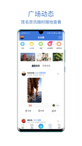 1、杂谈广场:用户可以在广场浏览新闻资讯,同时还可以各抒己见,聊各种话题,让生活不那么无聊。