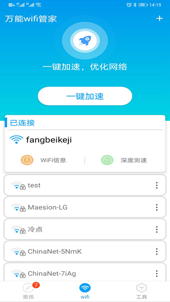 万能WiFi钥匙是一款主打WIFI连接管理的软件,如果你最近感觉家里的WIFI有些卡或外出时不知道哪些WIFI可以连接,那么不如试试这款软件吧,其界面简洁清爽,功能直观强大,操作简单便捷,且体积小巧占用,不影响用户的使用体验!用户可以通过该软件快速对WIFI进行诊断,让你全面掌握网络情况,以便尽早处理隐患信息!此外,还能对网络进行加速,以带来更好的使用体验!