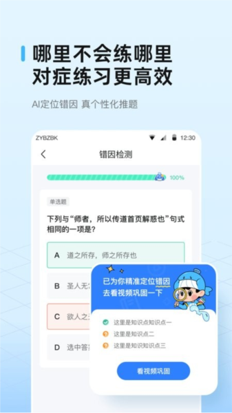 大数据题库: 应用拥有5.8亿+大数据题库,根据用户做题情况生成个性化练习,精准推题。