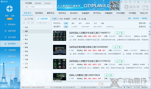 6、已收录20000+建筑图纸、模型,包括:规划、住宅、别墅、办公、商业、医疗、教育、宾馆、文娱、交通、工业、古建、公园、景观、水系、小品等类别