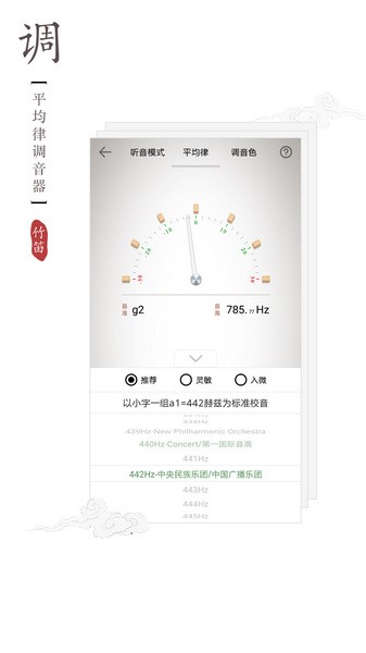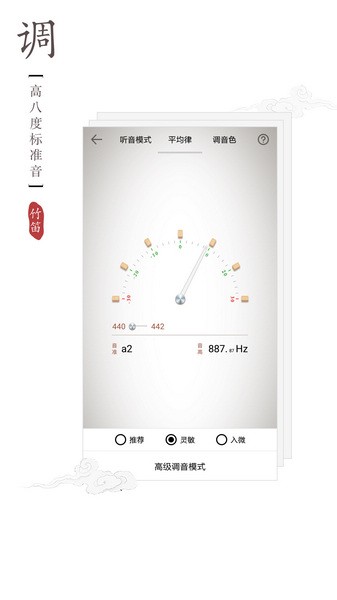 其中,听音模式,提供:竹笛、三十六簧笙、三角钢琴、扬琴,共4种基准音模式;